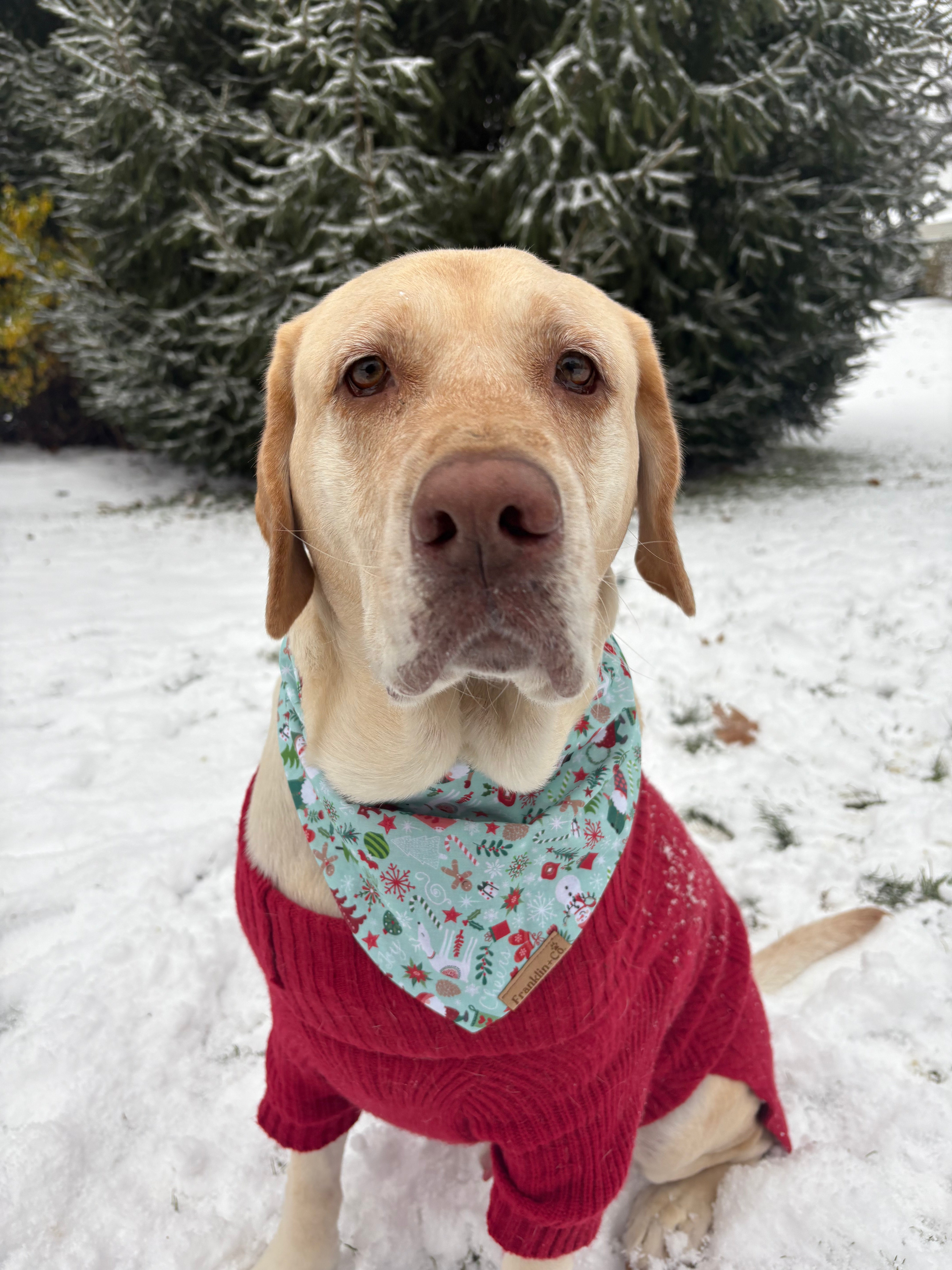 *This model, Ottie, is a Yellow Lab that is 90lb and wearing a size X-Large.